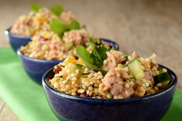 Salada de Quinoa com atum, cebola roxa, damasco, pepino, mini rúcula e nozes